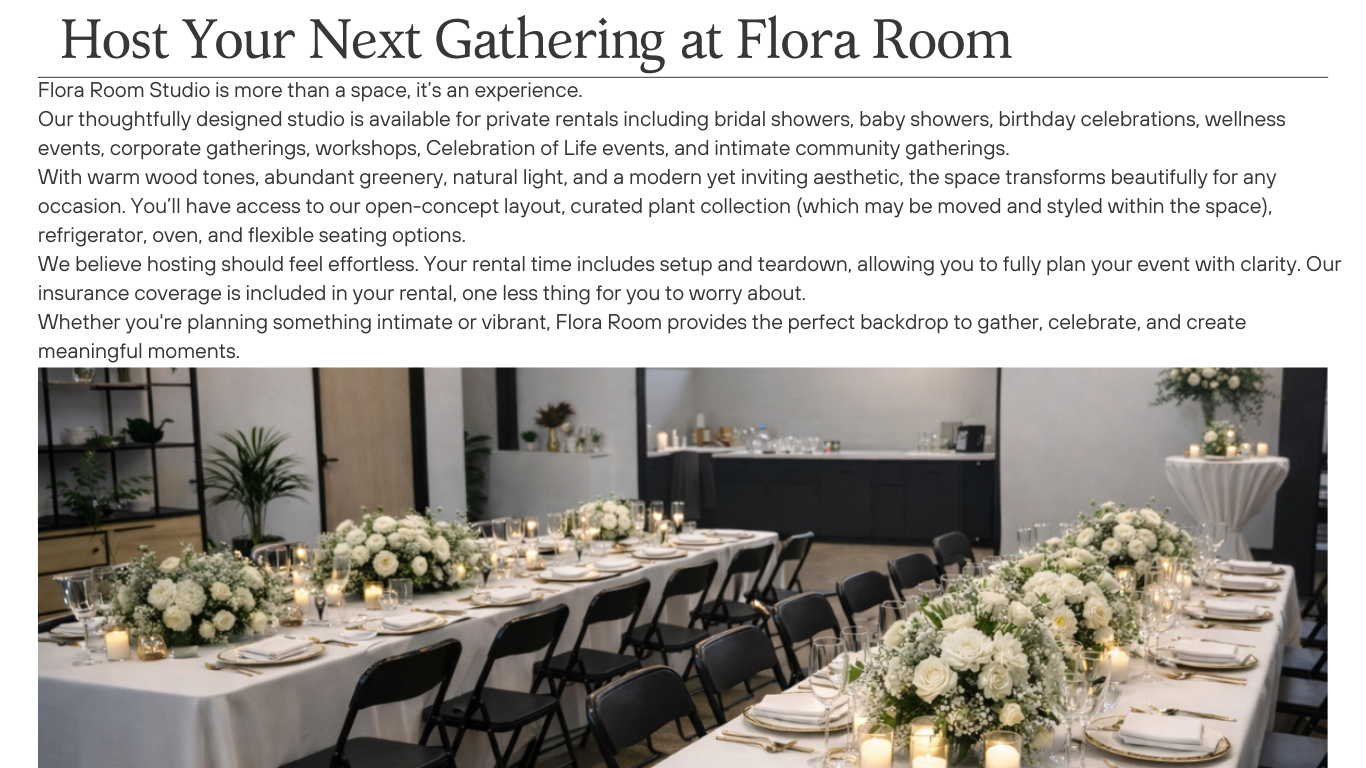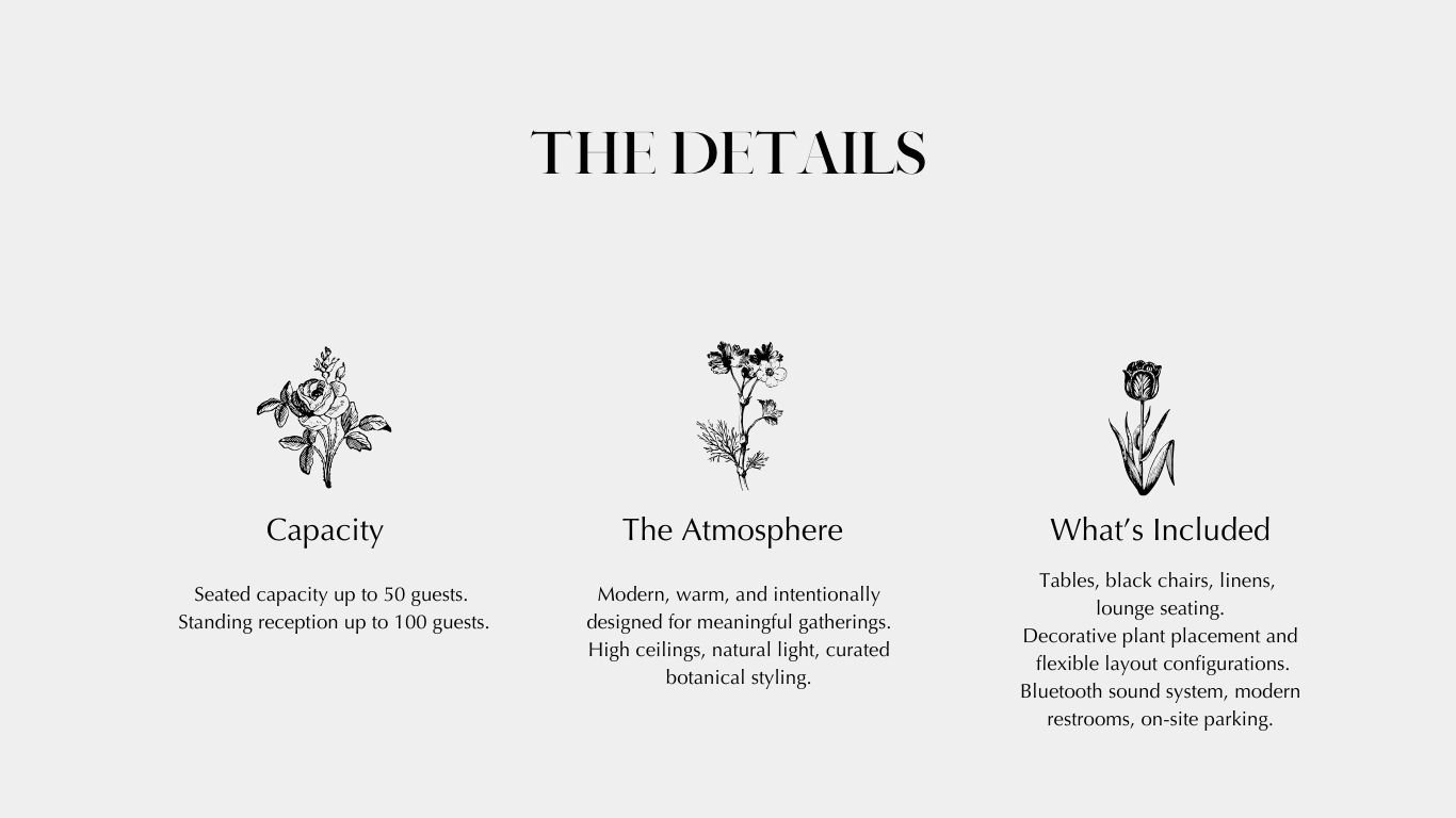 Planning your event at Flora Room? View our full rental details, add-ons, layout options, and event in spiration in our downloadable guide.